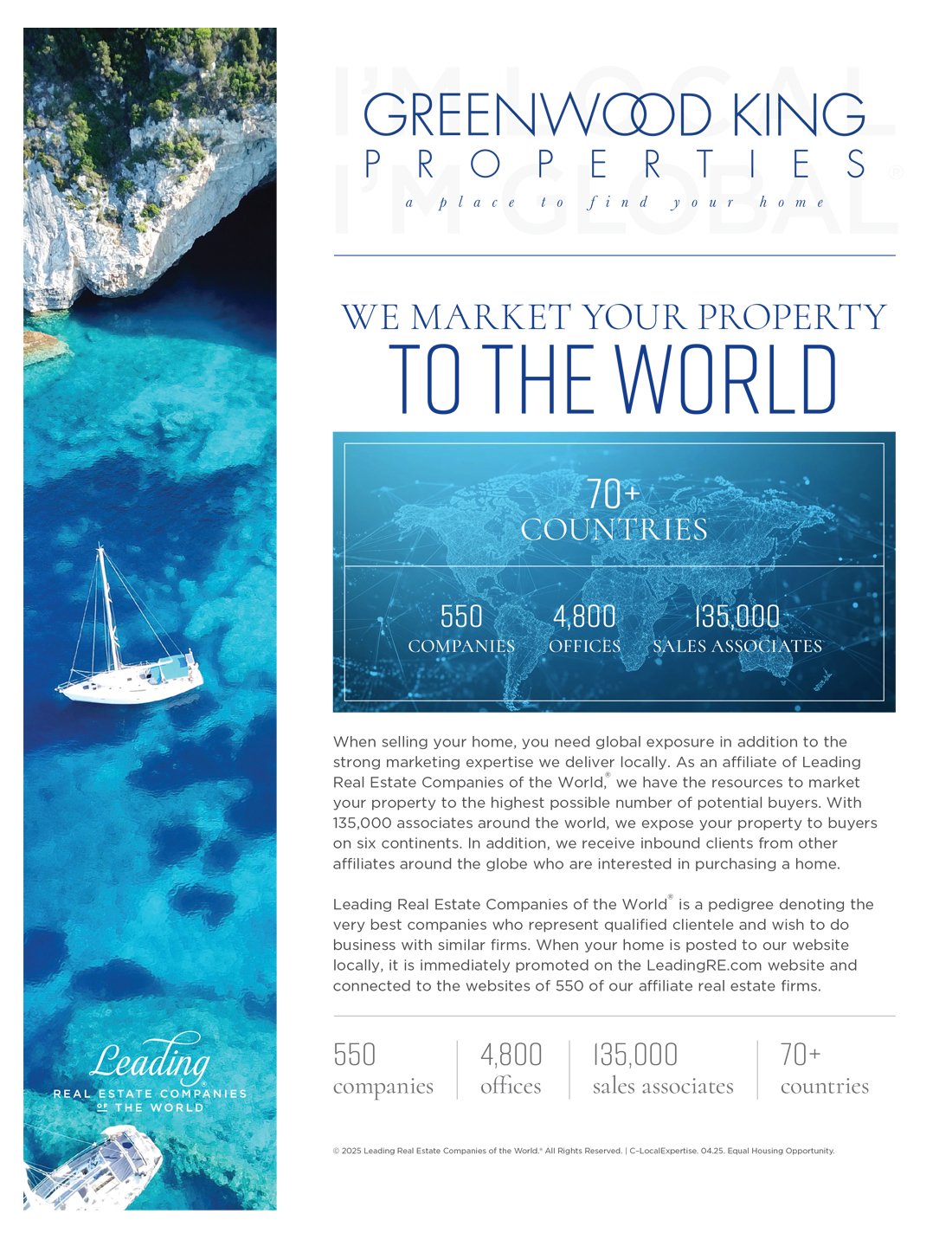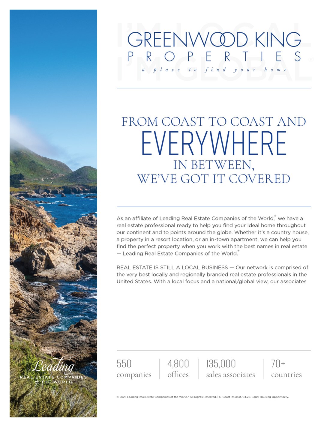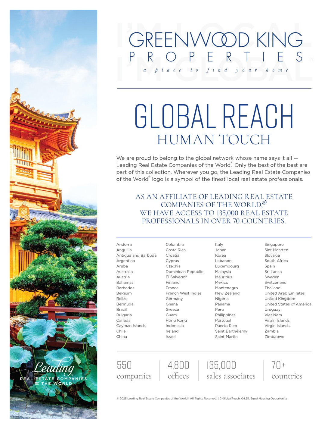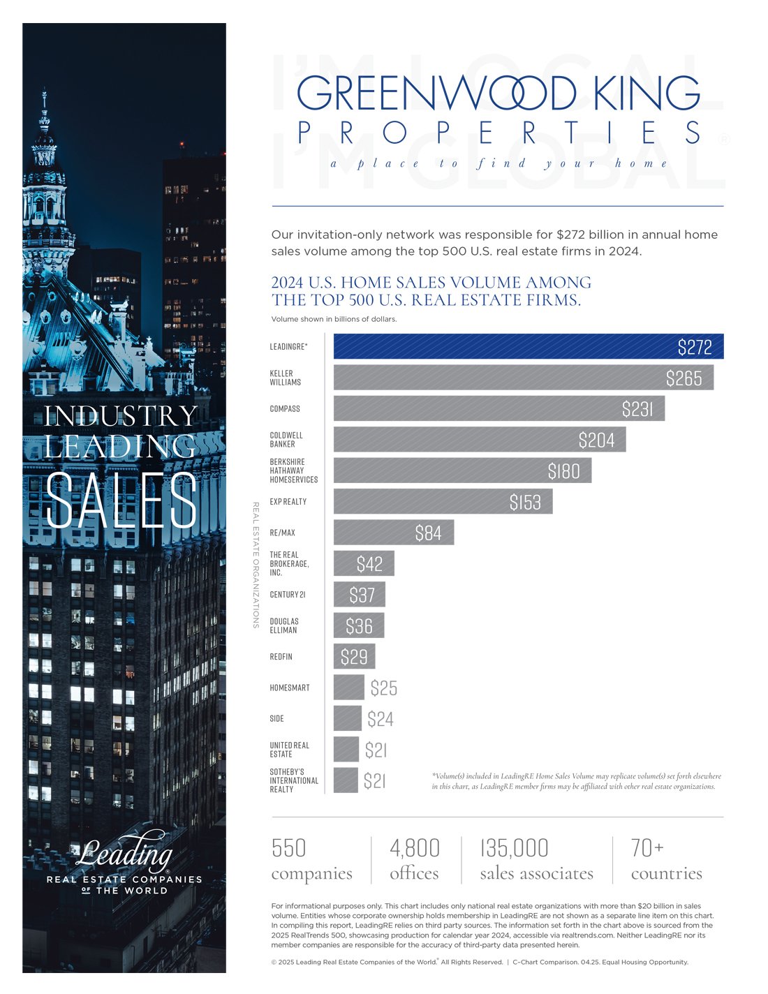 Leading Real Estate Companies of the World® (LeadingRE) is the home of the world's market-leading independent residential brokerages in over 70 countries, with 550 firms and 135,000 sales associates producing $272 billion in annual home sales volume among the top 500 U.S. real estate firms in 2024. Our by-invitation-only network is based on the unparalleled performance and trusted relationships that result in exceptional client experiences.